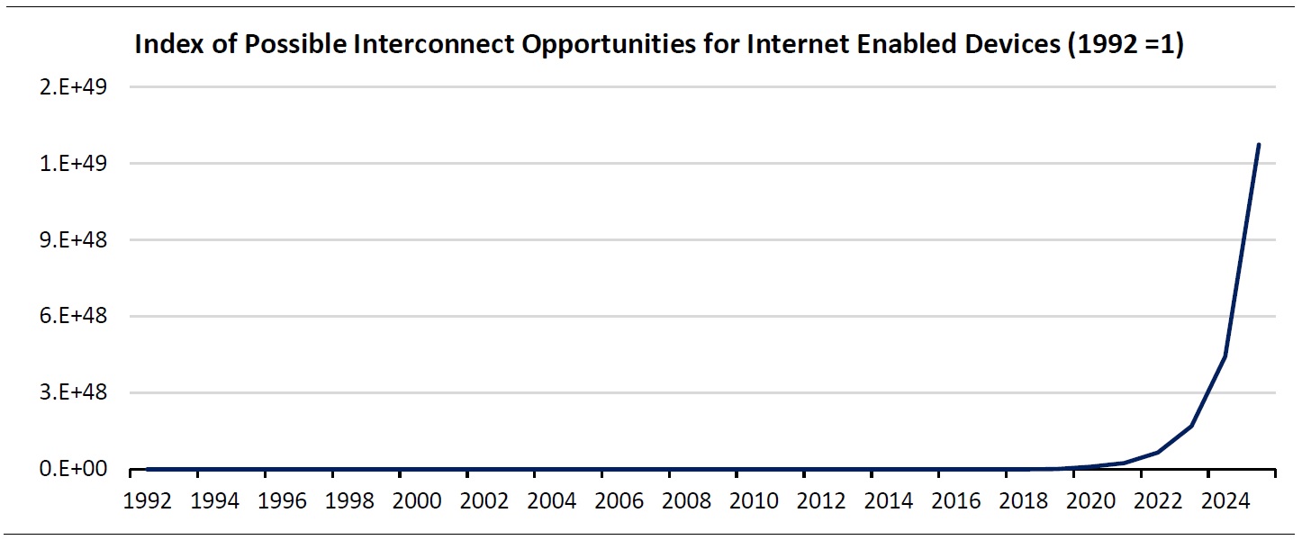 I have displayed this chart on natural number scale, instead of log scale to visually impress that, in my estimation, about 99.9999 percent of connections expected as of 2025 between devices on internet, are yet to be formed as of 2017. In other words, the connections between devices on internet will become denser by a factor of 10^5 in 2017-2025 period.