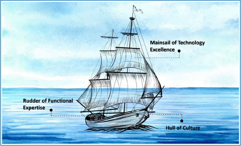 The way to look at the process of innovation is that Innovation Process can be thought of as a sailboat. The hull of this sailboat is the culture of the firm, the rudder of this sailboat is the functional expertise of the firm and the mainsail represents the winds of technology driving the innovation sailboat. For a layperson, it seems that technology alone matters since she sees only the correspondence between the technology and the innovation direction. However, the hull of culture has to be strong not only to absorb the force of technology changes but also to actually move forward in the desired direction. This desired direction comes from the functional expertise of the firm, hence we term it as the rudder of the sailboat of innovation. The layperson mostly misses the importance of the hull of the culture, in the journey of innovation sailboat, unless it is starts leaking. Also, she cannot fully comprehend that the functional expertise drives the direction of innovation.